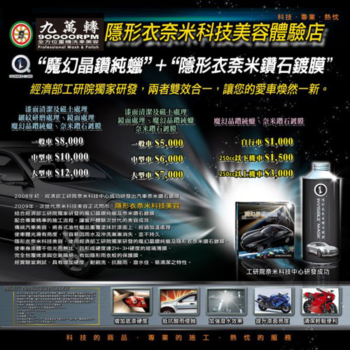 全方位重機汽車美容,採用次世代奈米科技美容技術,由經濟部工研院獨家研發的「隱形衣奈米鑽石鍍膜」與「魔幻晶鑽純蠟」,兩者雙效合一,讓您的愛車煥然一新。